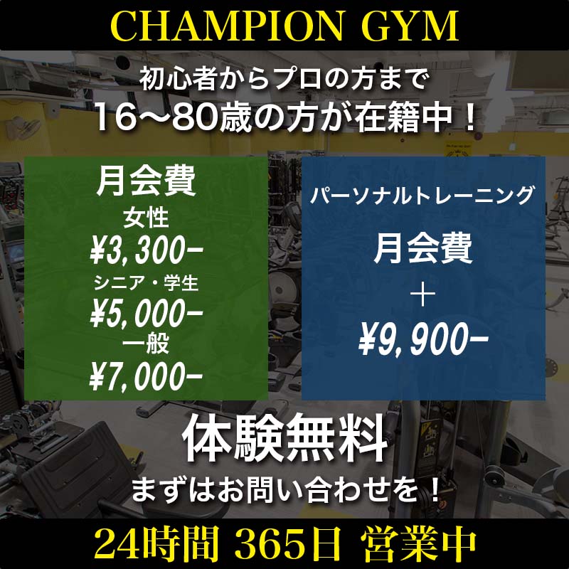 いつもチャンピオンジムをご利用いただきまして誠にありがとうございます。 1月1日(金)はスタッフ不在となります。 見学、体験、ビジターご利用が出来かねますので、ご迷惑をおかけしますが予めご了承くださいませ。 会員様は通常通り24時間ご利用いただけます。 日頃よりお客様には衛生管理のご協力をいただきまして、ありがとうございます。 当ジムもアルコール消毒、室内換気、衛生管理の更なる強化に努めて参ります